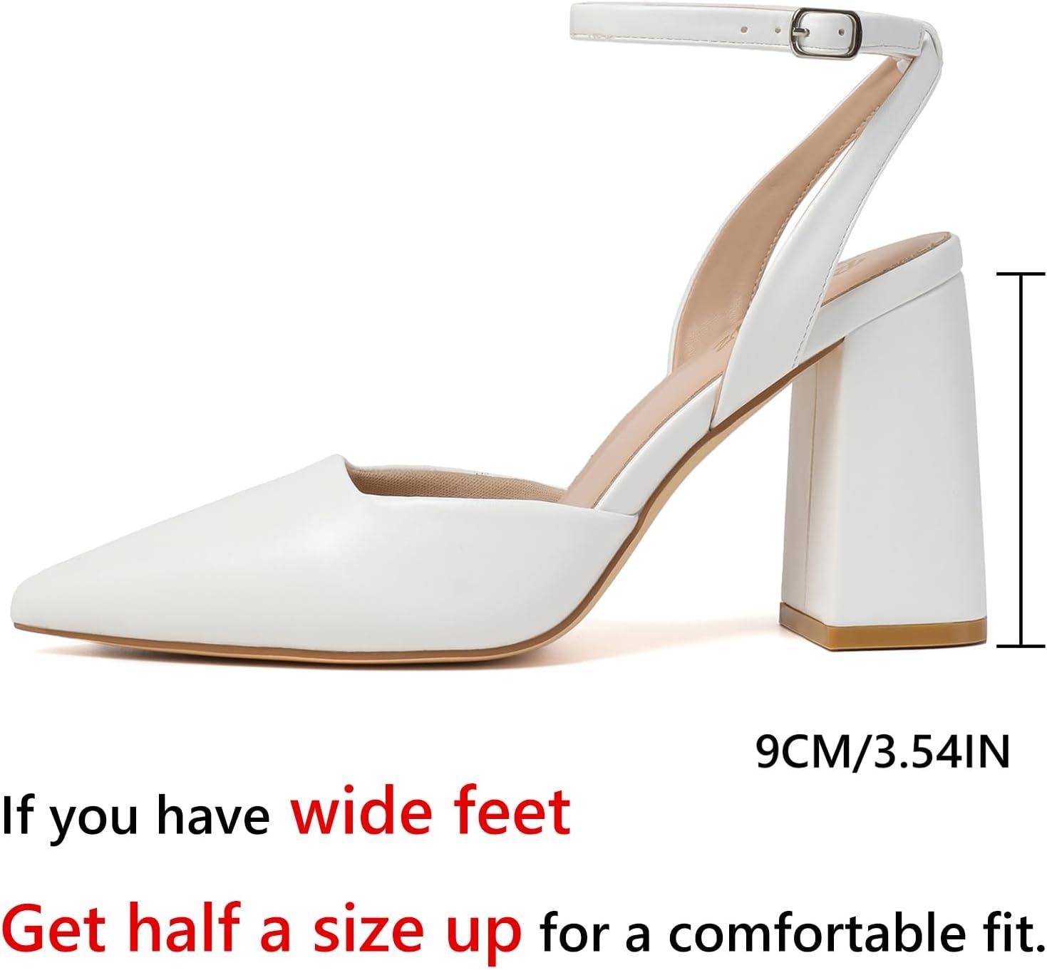 RIBONGZ Block Heels for Women Closed Pointed Toe Heeled Slingback Chunky High Heel Ankle Strap Pumps Patent Leather Comfort Dressy Shoes for Work Party Prom Wedding Bridal Dress(White Leather)