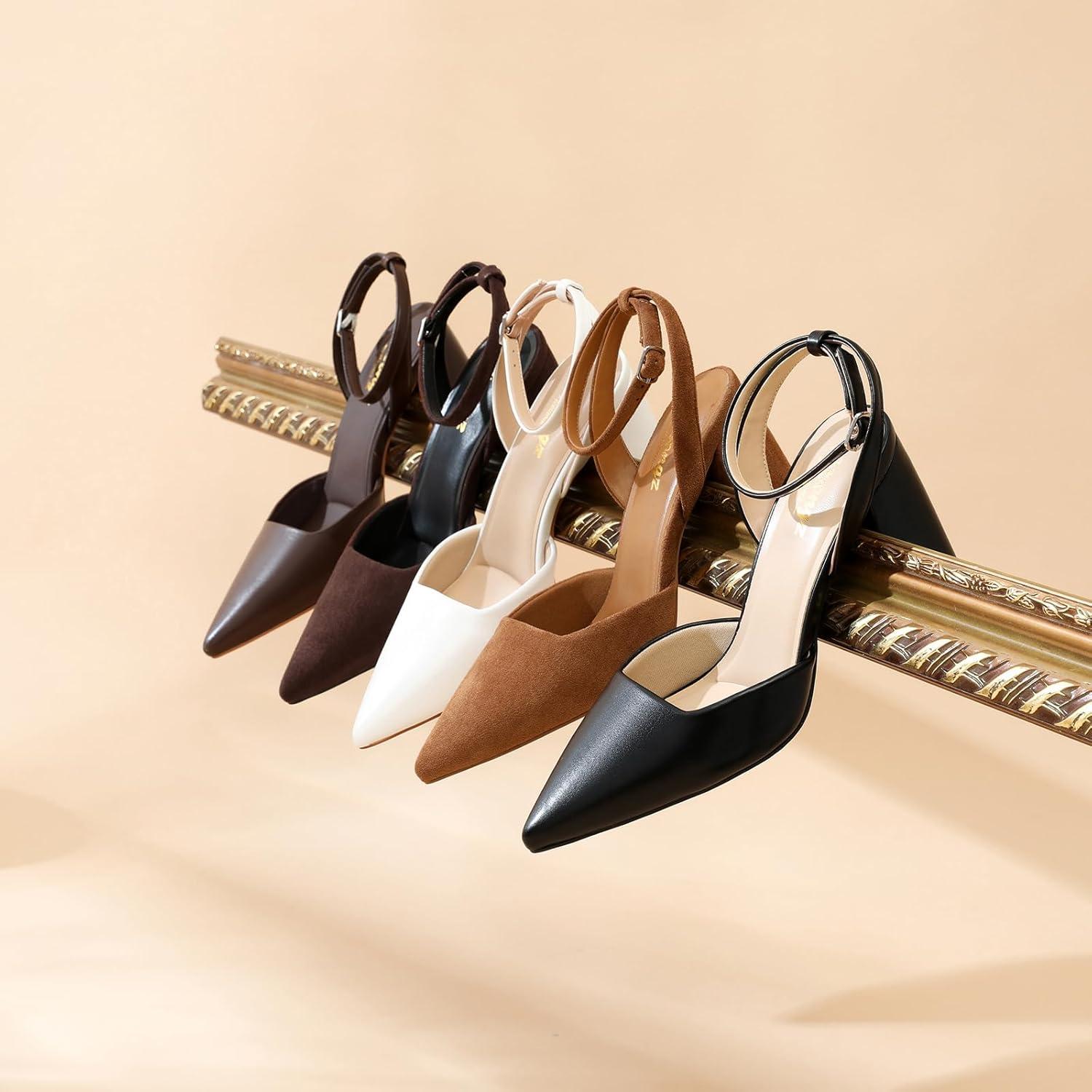 RIBONGZ Block Heels for Women Closed Pointed Toe Heeled Slingback Chunky High Heel Ankle Strap Pumps Patent Leather Comfort Dressy Shoes for Work Party Prom Wedding Bridal Dress(Nude)